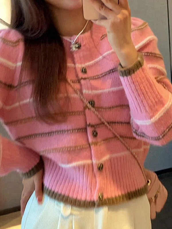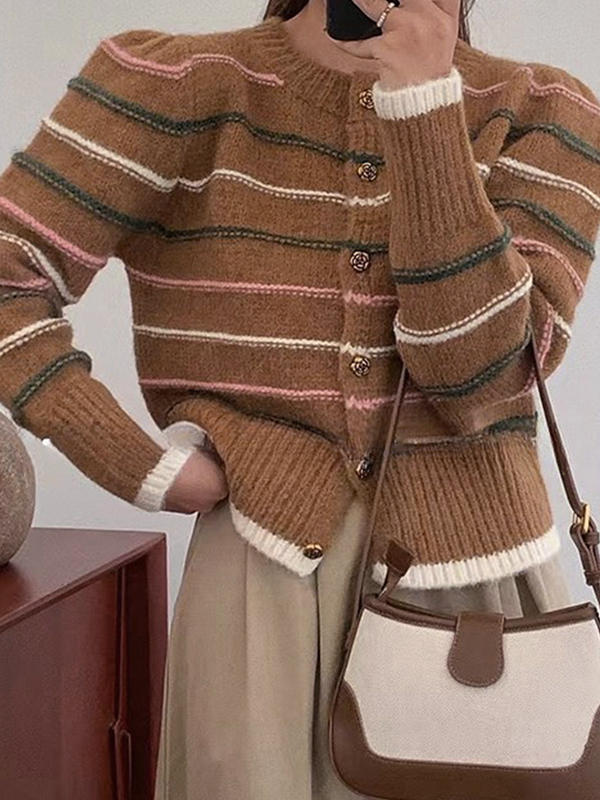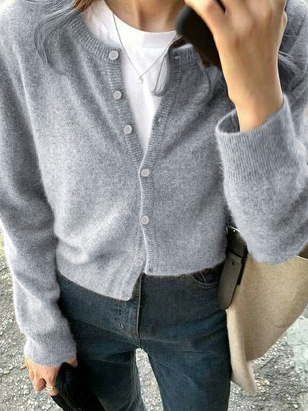Three Dimensional Flower Decor Crew Neck Knit Cardigan