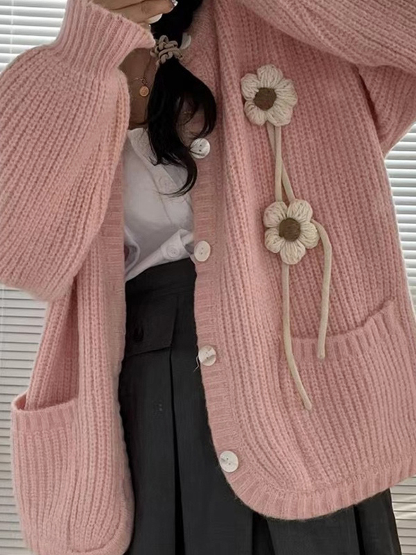 Three Dimensional Flower Decor Crew Neck Knit Cardigan