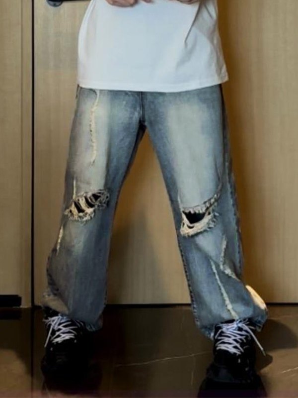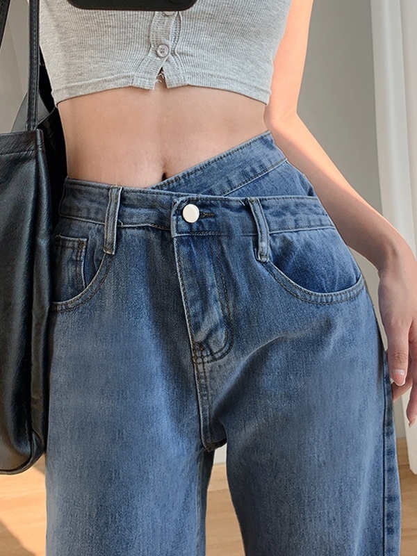 Skull Rose Print Vintage Blue Wide Leg Boyfriend Jeans