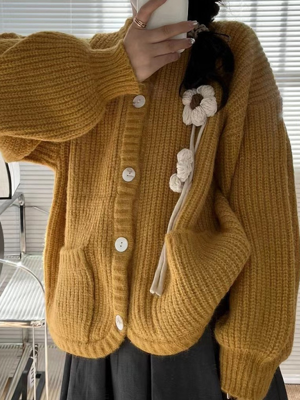 Three Dimensional Flower Decor Crew Neck Knit Cardigan