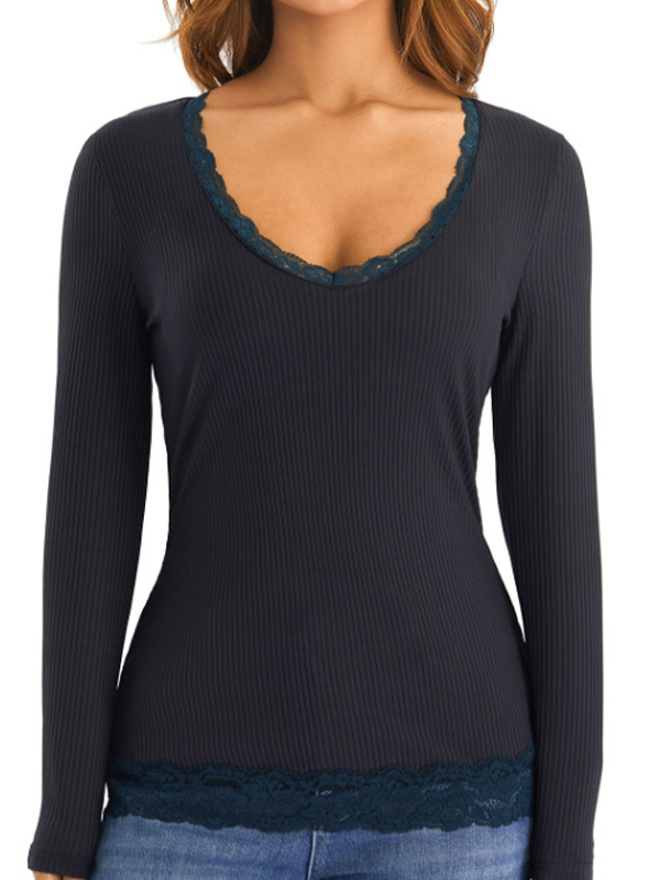 Solid Color Rib Lace Trim Slim Long Sleeve Knit